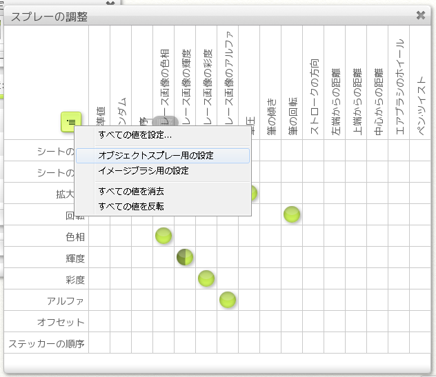 とりあえず左上にあるメニューから「オブジェクトスプレー用の設定」か「イメージブラシ用の設定」のどちらかを選ぶ。