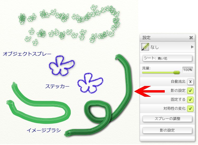 イメージブラシのときに、影の設定のチェックをオンにすると立体感が出ます。