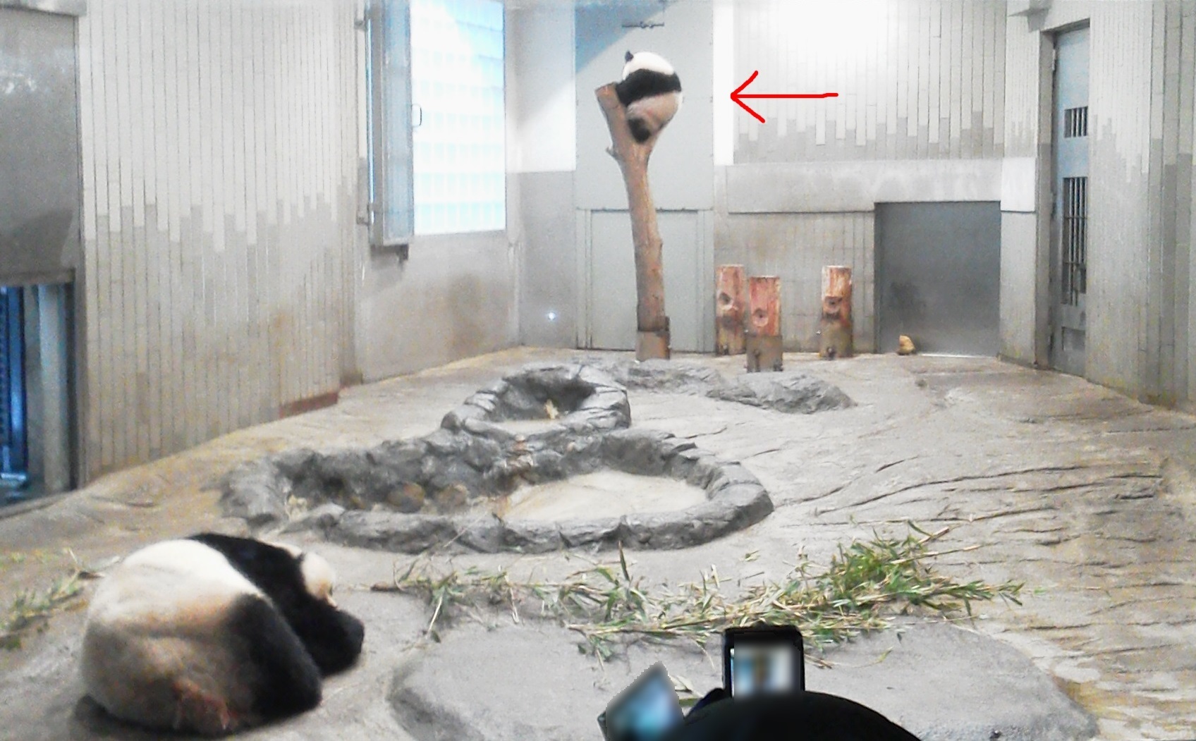 ムコウ向いたまんまだったけどなんかかわいい。手前で寝てる母親と比べるとやっぱり小さい。そして、こんな棒によじ登れるってパンダすごい。